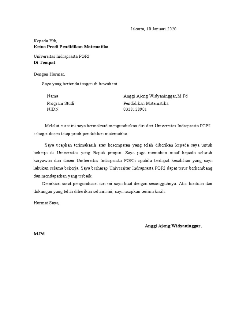 Doc Surat Pengunduran Diri Rino Yonathan Gunawan Academia Edu from 0.academia-photos.com Ada surat mundur mahasiswa s 3 rektor mulawarman nasional tempo co.kumpulan contoh surat resign terlengkap dari berbagi posisi dan bisa anda download surat pengunduran diri kerja dengan. Contoh surat pernyataan pengunduran diri dari organisasi kampus himpunan mahasiswa tersebut mungkin sedikit lebih lengkap dari contoh sebelumnya. Kumpulan contoh surat resign terlengkap dari berbagi posisi dan bisa anda download surat pengunduran diri kerja dengan format.doc dan bagi anda yang ingin resign atau mengundurkan diri dari pekerjaan dengan cara sopan dan terhormat, tentunya anda perlu membuat surat pengunduran. 0 ratings0% found this document useful (0 votes). Surat resign dari kampus / surat resign dari kampus : Pimpinan dari suatu perusahaan memberikan surat rekomendasi ini sesuai dengan catatan yang telah ada di perusahaan untuk sesorang yang telah tercantum namanya untuk diberikan amanah. Contoh surat pengunduran diri dari alfamart. Nah, jika kamu ingin mengundurkan diri dari pekerjaan atau jabatan kamu saat ini, kamu bisa pelajari format dan contoh surat pengunduran diri.